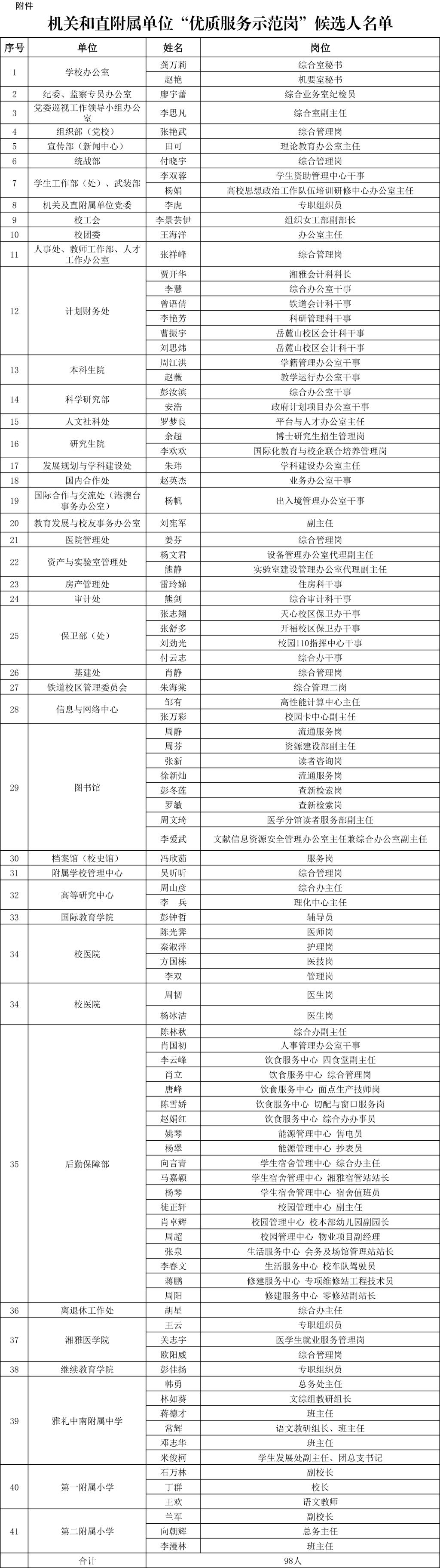 根据《中南大学机关作风建设年活动实施方案》要求,经各部门单位推荐申报,学校纪委办等部门审查,并报中南大学机关作风建设年活动领导小组审定,拟将龚万莉等98名同志作为机关和直附属单位“优质服务示范岗”候选人(具体名单见附件),现予以公示。